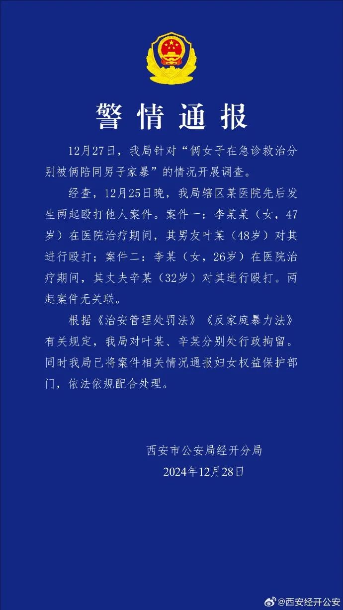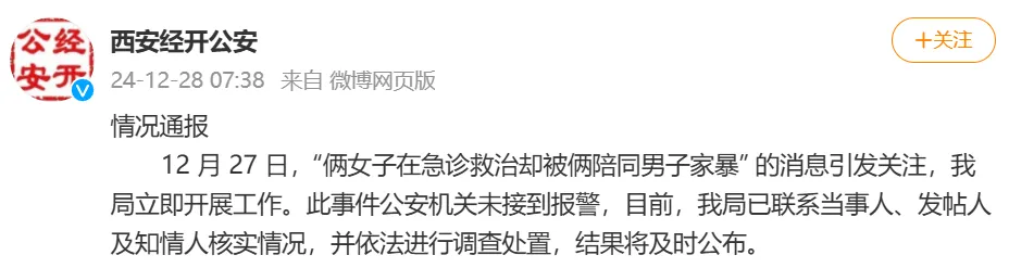 12月28日早,@西安经开公安 发布情况通报。通报称,12月27日,“俩女子在急诊救治却被俩伴随须眉家暴” 的音尘激发温雅,经开分局立即开展使命。此事件公安机关未接到报警,经开分局已经营当事东谈主、发帖东谈主及知情东谈主核实情况,并照章进行探询贬责,恶果将实时公布。